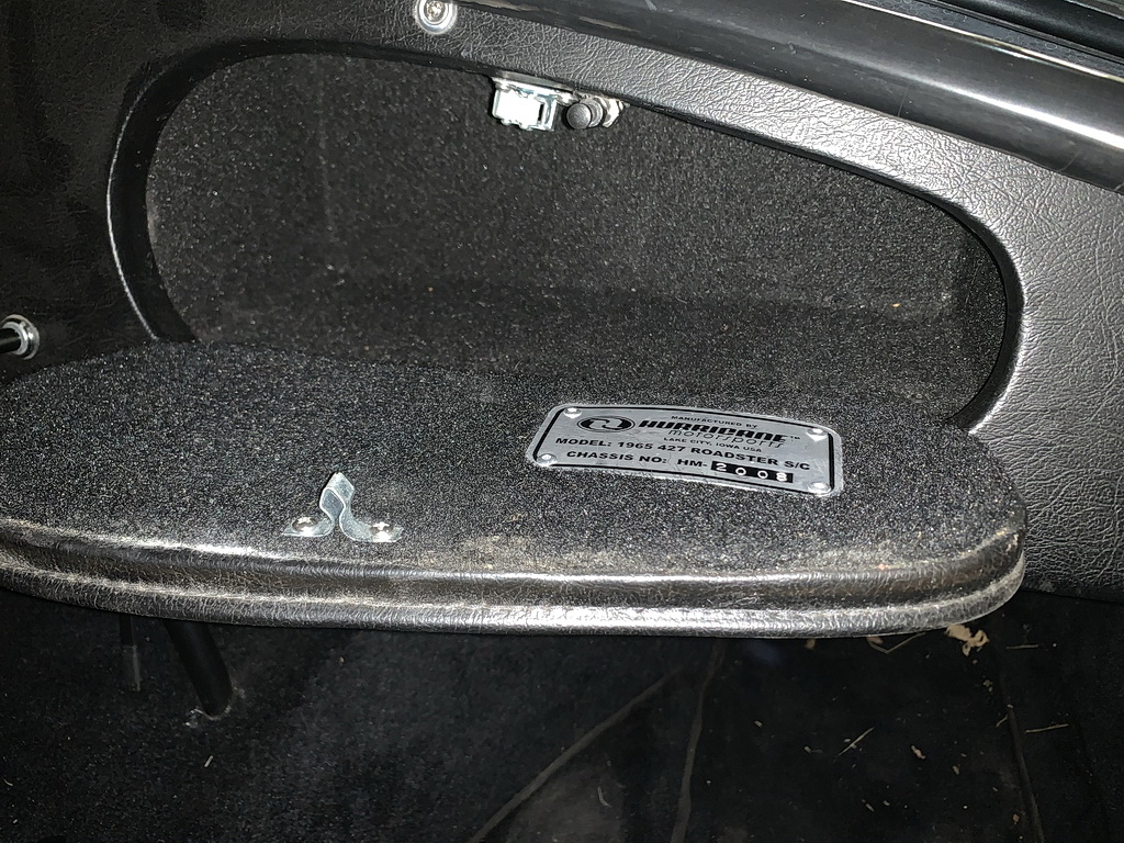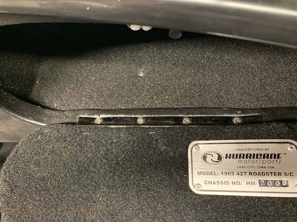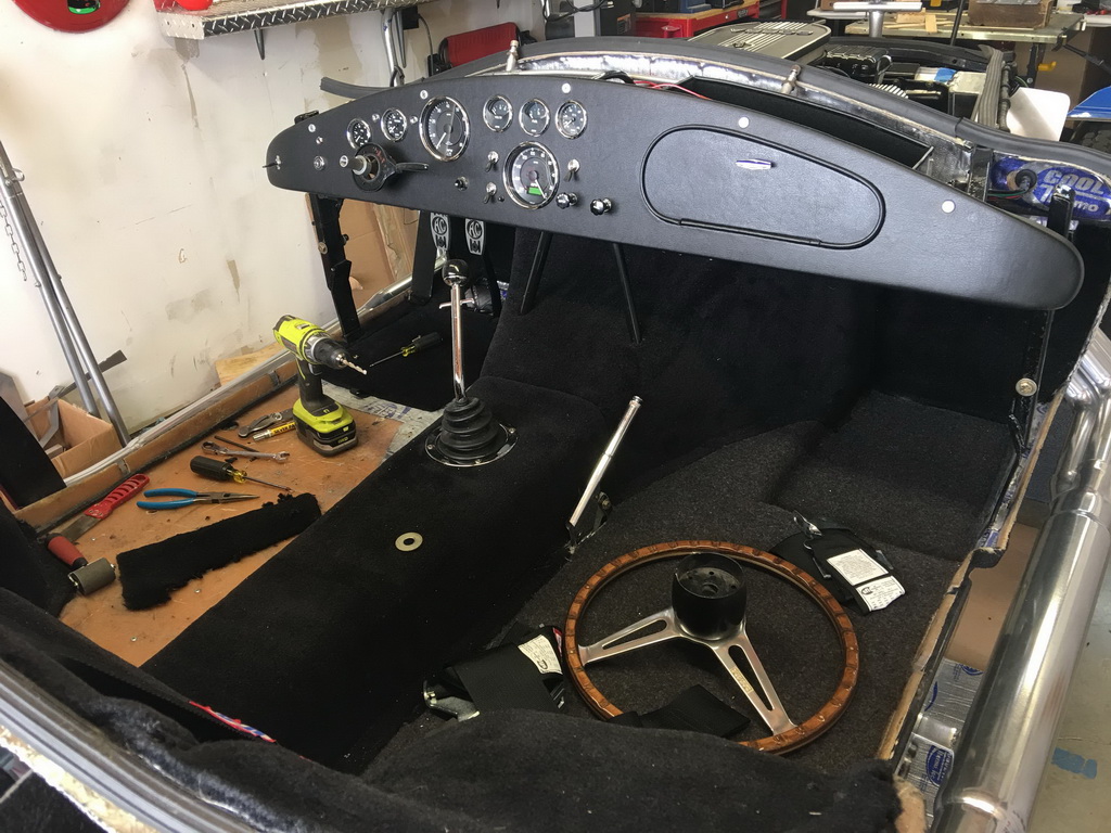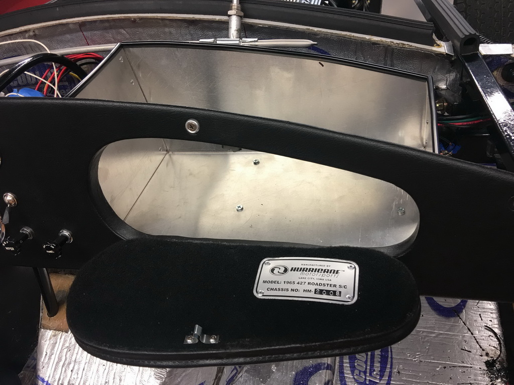 I didnt have access to an original 427 Street Cobra to determine the correct glove box door size and shape, so I traced a template of the shape off a friend's ERA cobra which appeared very close to accurate. I then made the core of the door from 3/4" hardwood, cut a chromed piano hinge to length and cut a recess into the bottom edge of the door for the hinge. I then took the door core to a local hot rod uphostery shop. I provided the shop with extra vinyl from Hurricane so it would match the dash, and pictures of an original 427 street Cobra glove box door. I think they did a pretty good job. At the time I also provided a cheap drawer pull from the local hardware store. I later replaced the pull with an original style door pull.