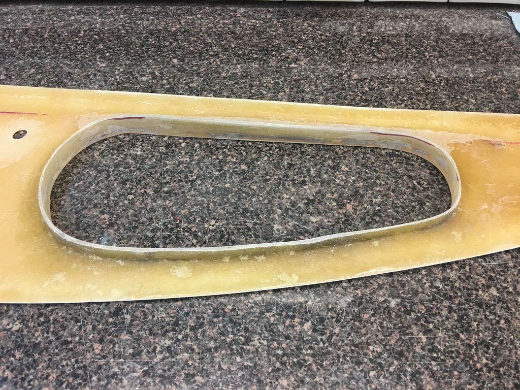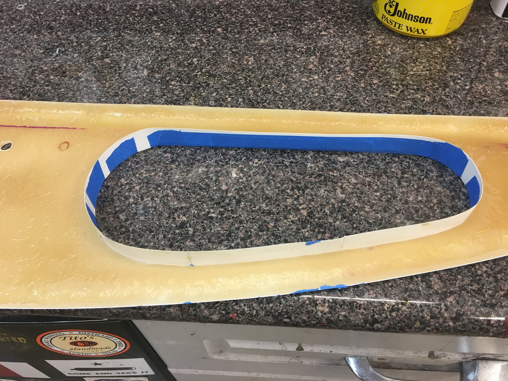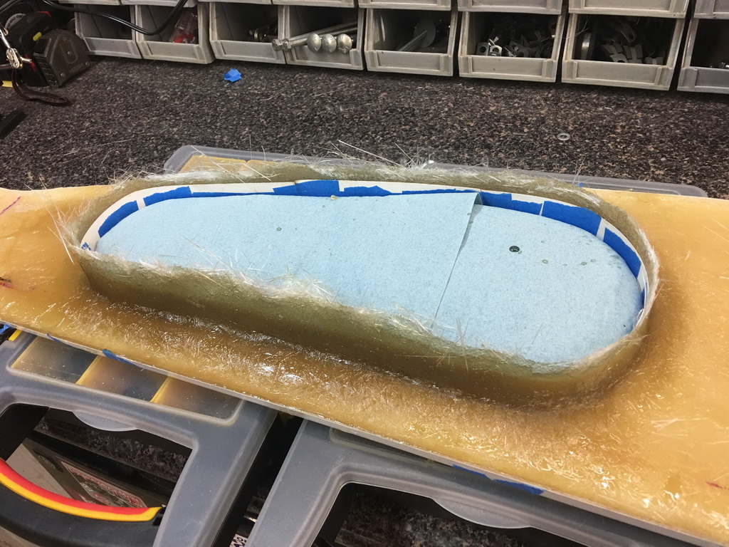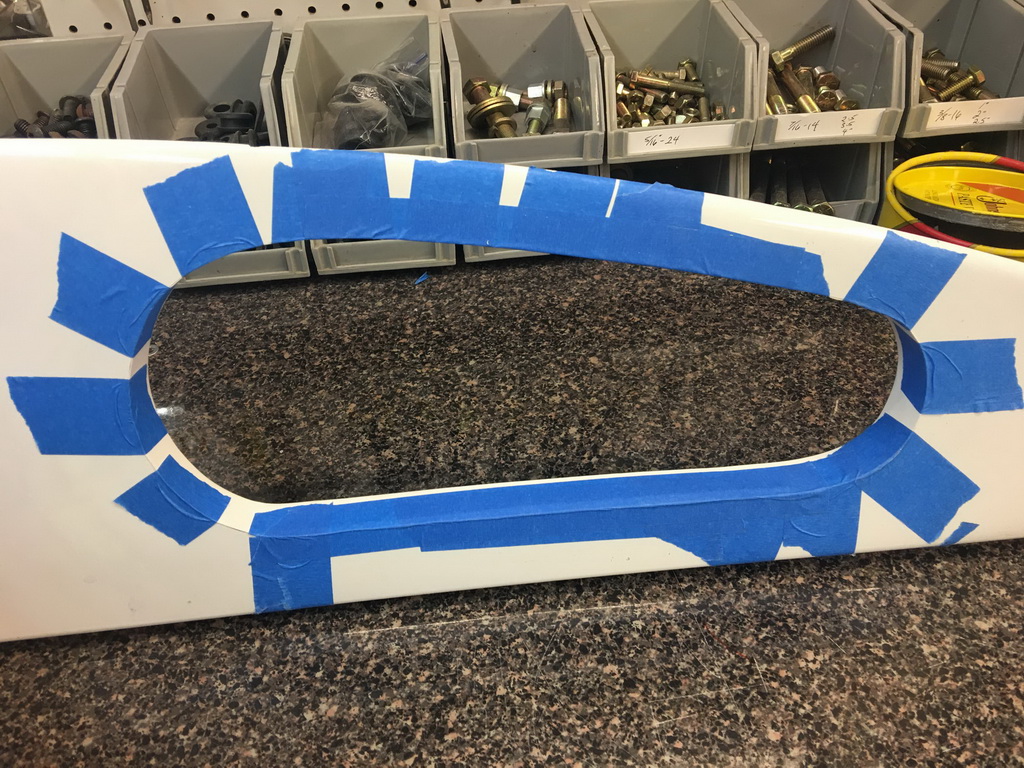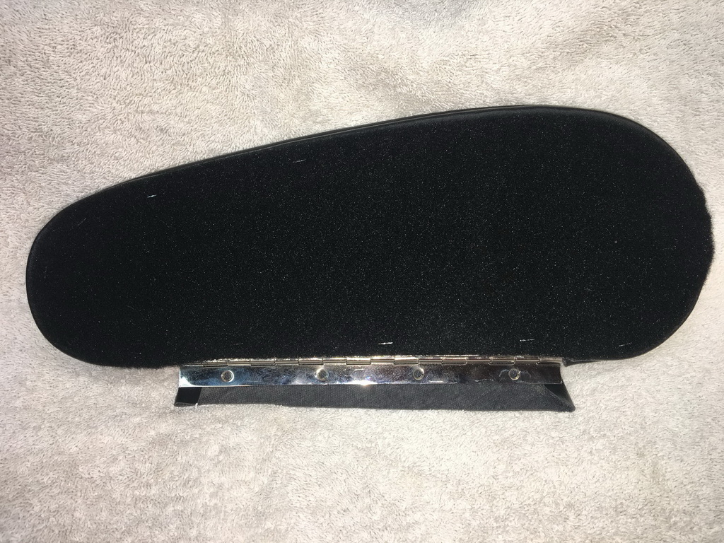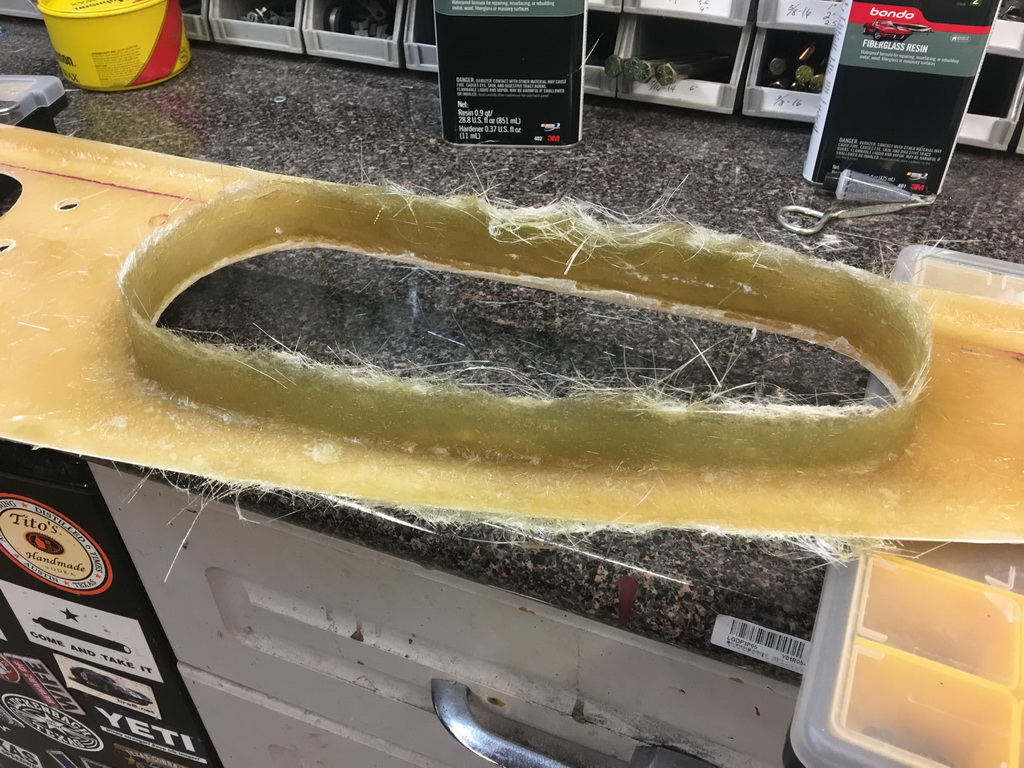 I made sure the upholstered door would fit into the dash opening I had already cut, removing more material to allow the upholstered door to clear the opening. I then used posterboard to create a form for a lip inside the door opening. I laid the door into the opening, protected by shop towels, to support the liberglas mat and resin while it cured. I made sure to make the bottom edge of the lip thick enough to grab the hinge screws.