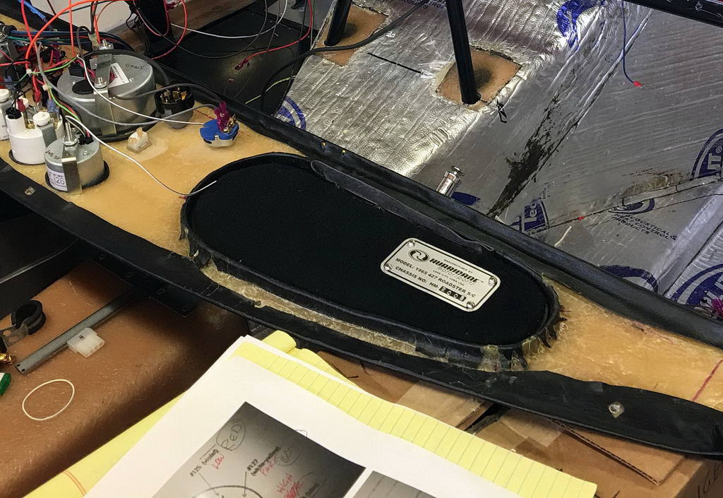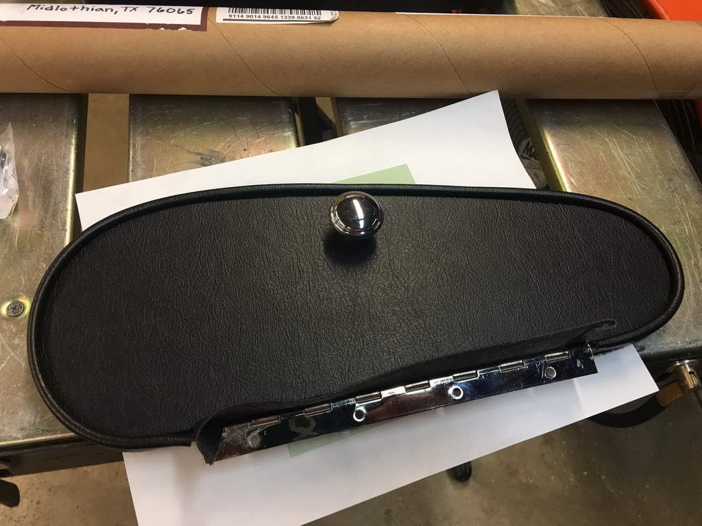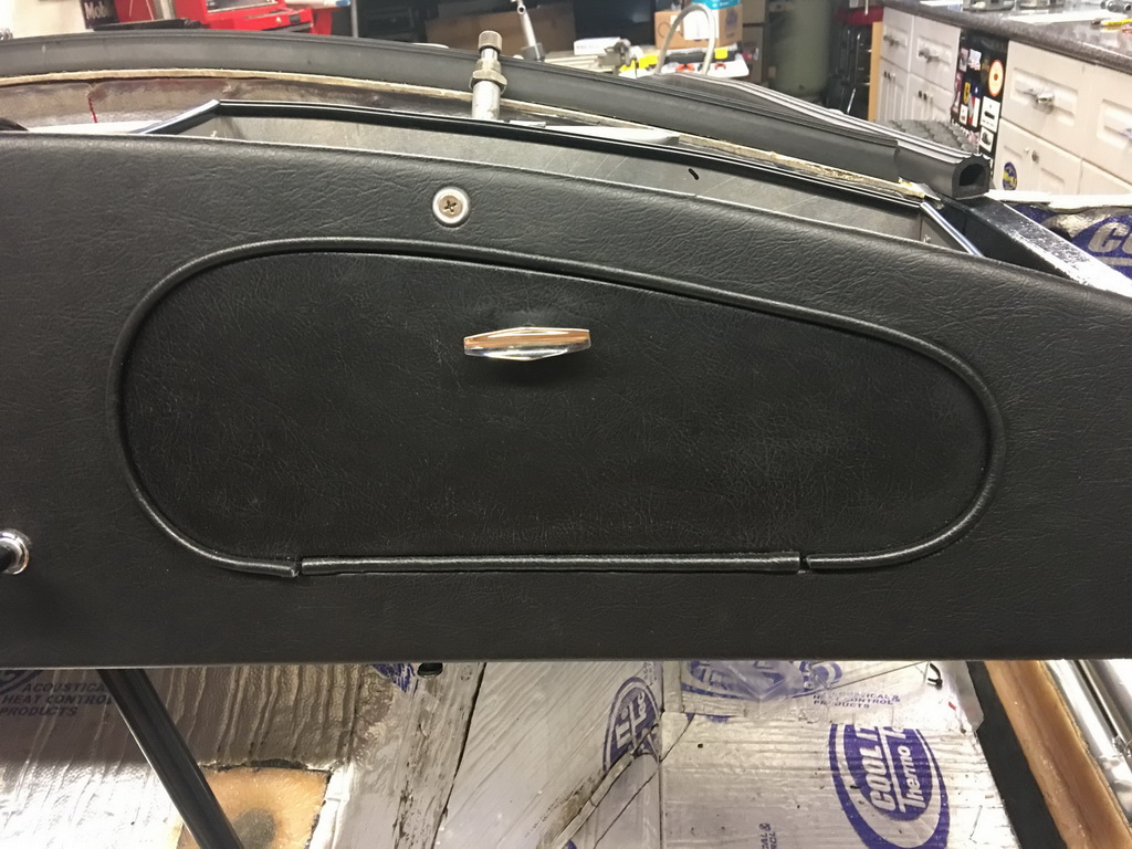 After the fiberglas cured, I trimmed and sanded down the door opening, test fitting the finished door several times until it fit right. After covering the dash with the vinyl I attached the door to the dash using the self-tapping screws provided with the piano hinge. I also replaced the door pull with the correct original part from Acton Custom Enterprises.